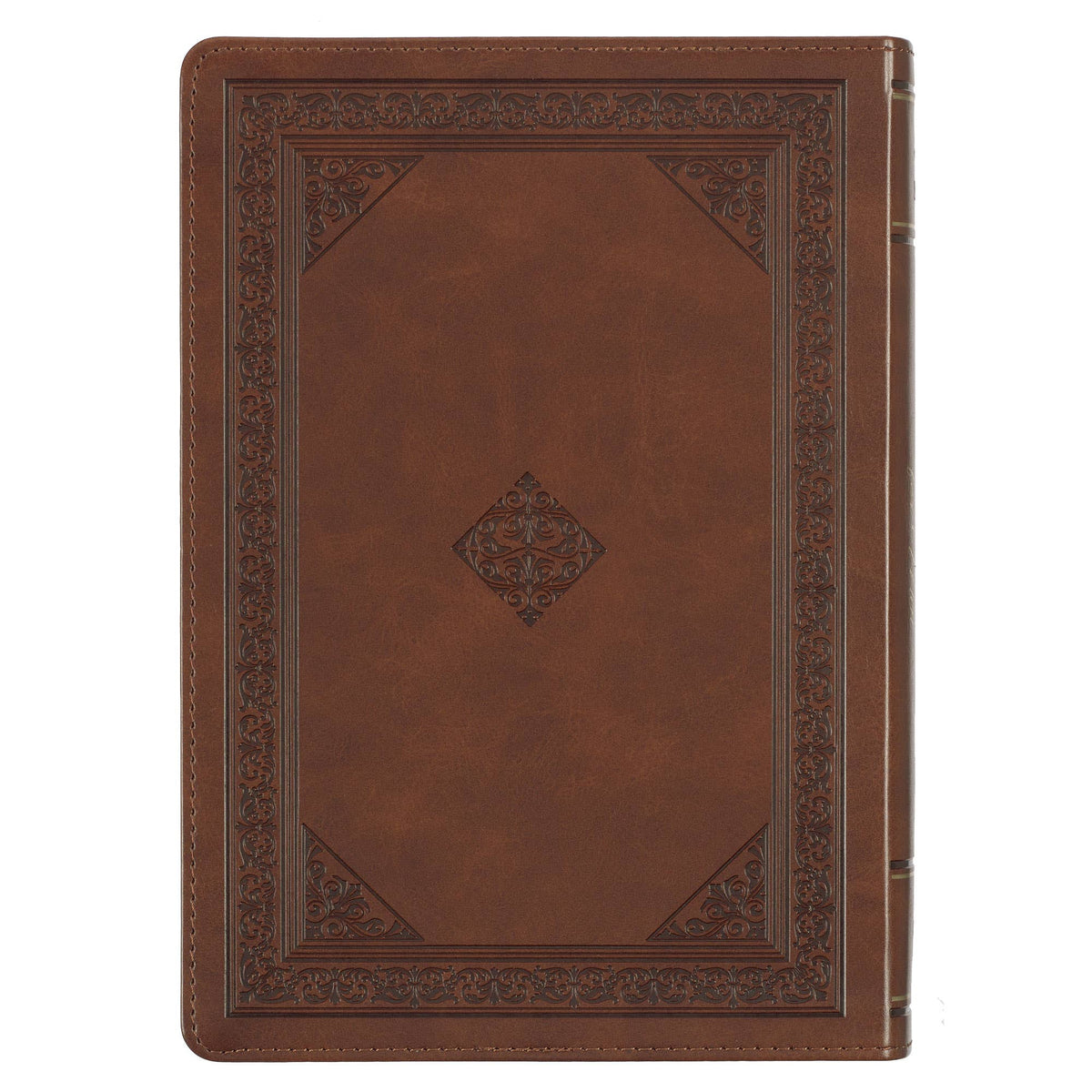 Heat-debossed frame with intricate floral fill and corner scroll cover design, Chestnut brown faux leather, Gold-foiled title, Heat-debossed translation reference, Flexcover, New Living Translation, Satin ribbon marker, 1824 gilt-edged pages, Two-color interior, Single column format Presentation page, Daily portions from Psalms, Proverbs, Old and New Testament, 730 inspiring devotional insights by Mike Beaumont, 10-point text, Packaged in a full-color printed cardstock sleeve, Size: 9.6" x 6.8" x 1.8" (244 x 173 x 46mm)