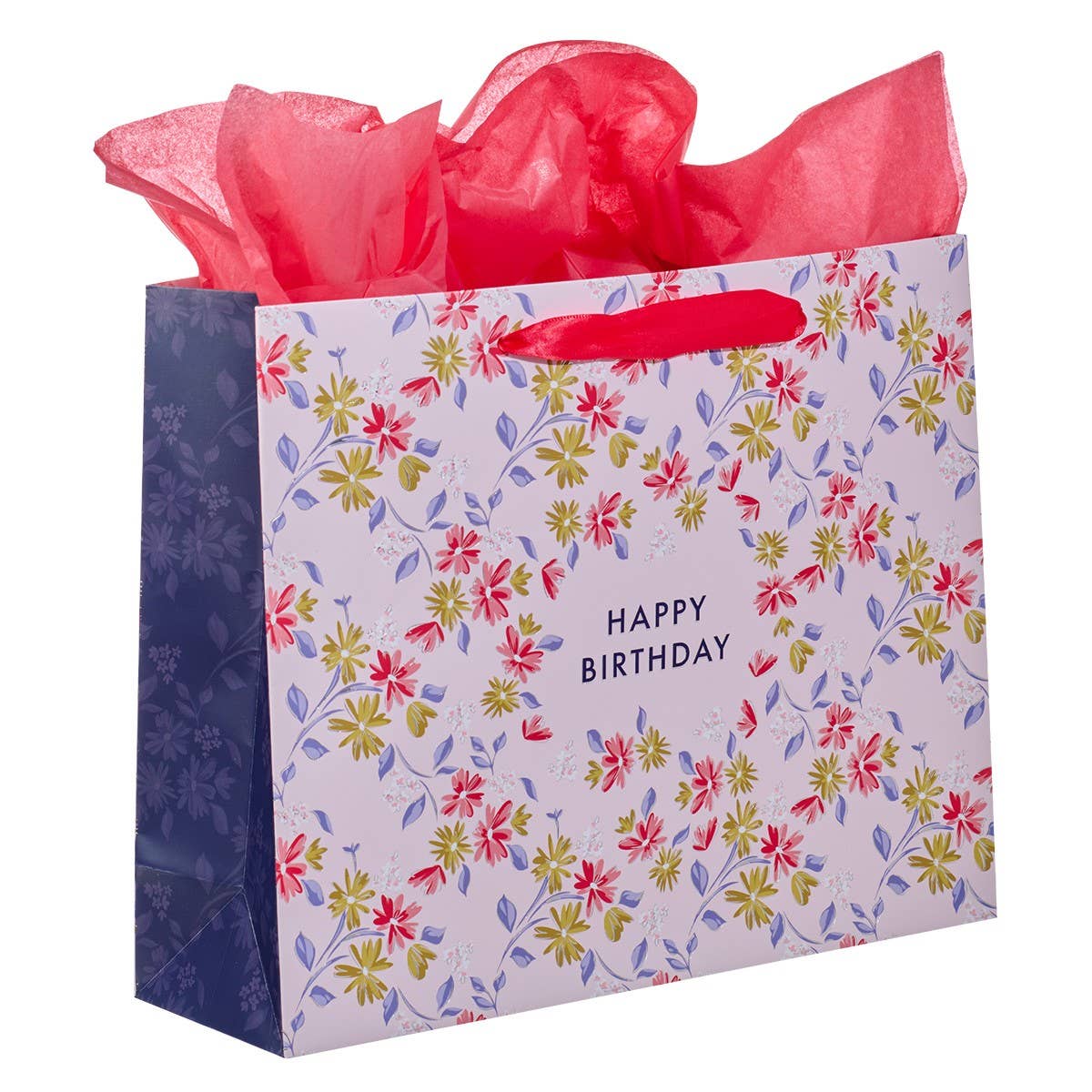 Share your excitement about a loved one's special day when you wrap your present in the cheerful Happy Birthday Pink Flower Trellis Large Landscape Gift Bag Set—a joyful sight on any gift table.