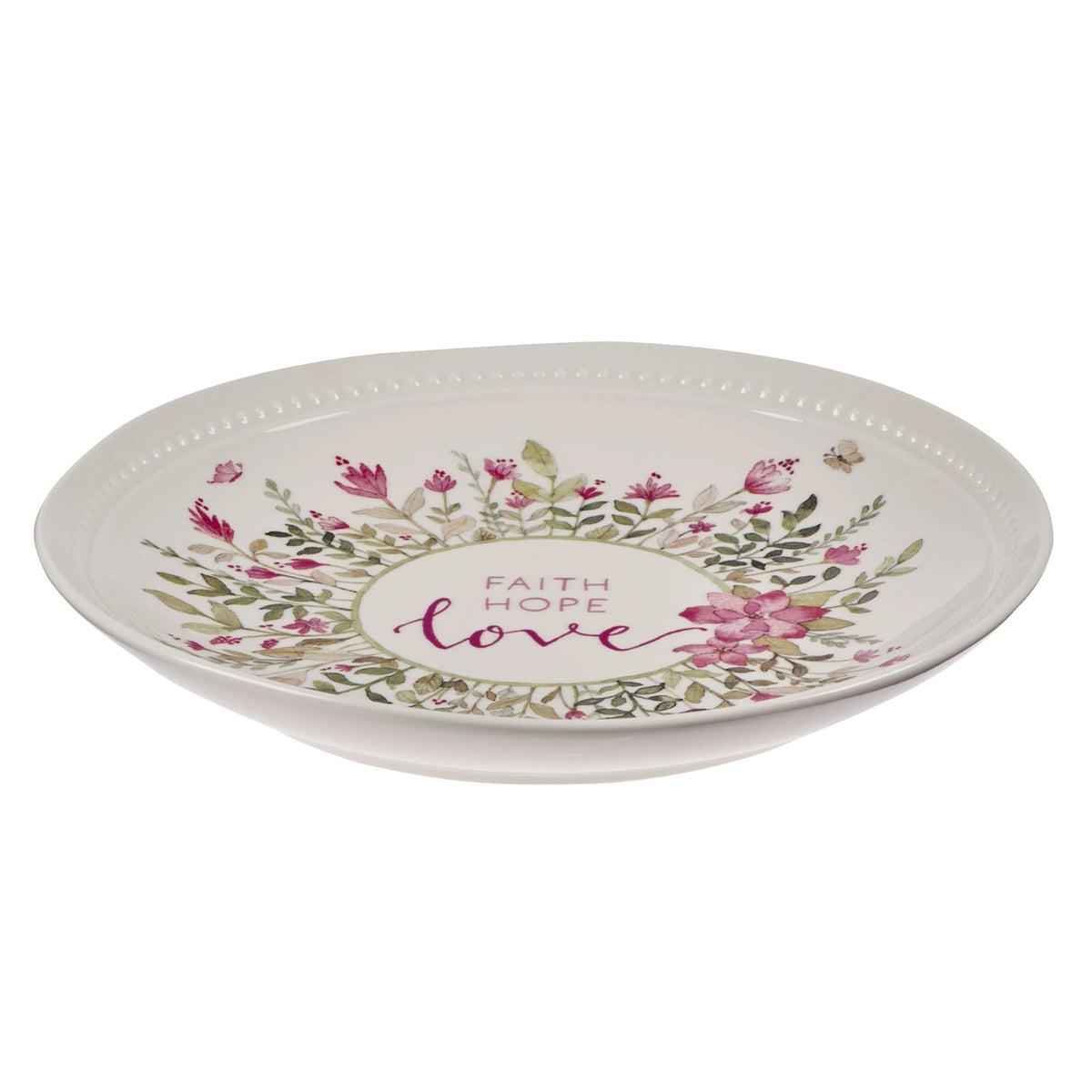 Update your kitchen counter with the Faith, Hope, Love Pink Floral Ceramic Plate. This food-safe plate, adorned with a petite floral design, will look fantastic on your counter and share a special message whenever it is used to serve food. Petite pink floral design, White ceramic plate, Pink screen-printed lettering, Faith Hope Love, Petite Floral Collection, Slip-dotting, Food safe, Hand-wash recommended, Not microwave safe, Packaged in a tuck-top Kraft cardboard box, Diameter: 9 inches (229mm), Packaging dimensions: 1.5" x 9.2" x 9.2" (38 x 234 x 234mm)