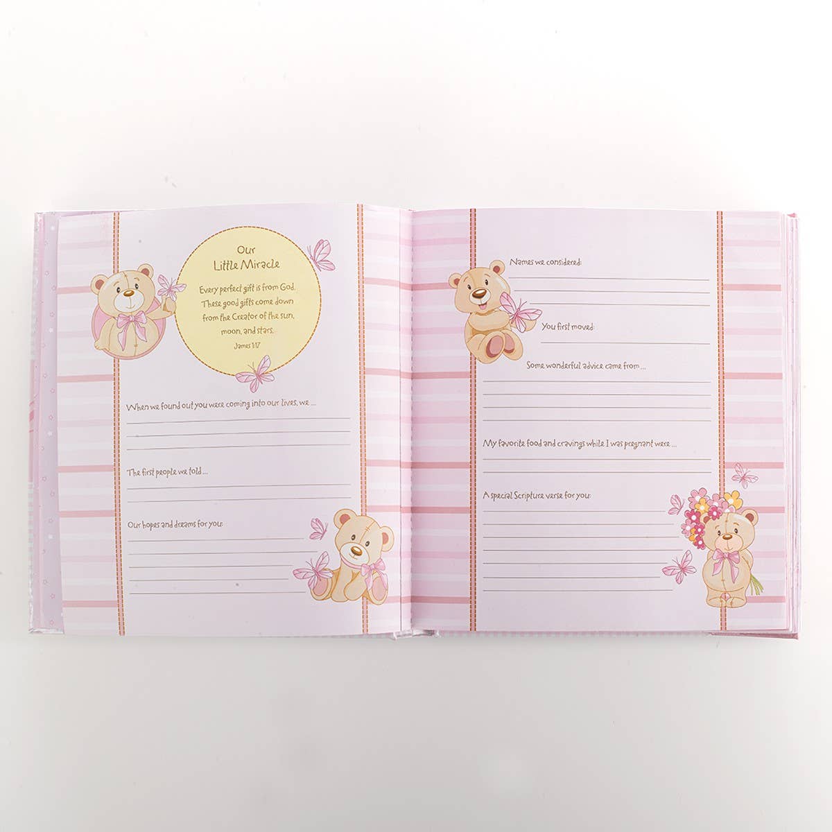 This sweet pink gingham baby book for girls is 64 pages of keepsake records of a baby's birth and first year. There are prompted pages to fill in, scrapbooking pages for photos and more, small envelopes for the hospital bracelet and a lock of hair from the first haircut, and 2 full pockets for assorted keepsakes. The pages carry quotes, poems, prayers and verse from Scripture - all conveying the beauty and design of bringing forth this new life. Soft Pink Gingham Design, Padded Cover, Magnetic Closure, Die-Cut Photo Frame, 64 Full-Color Pages, Full-color Interior, Acid-Free Paper, Packaged In Gift Box With Acetate Window, Size: 10.8" x 9.8" x 1.6" (274 x 249 x 41mm)