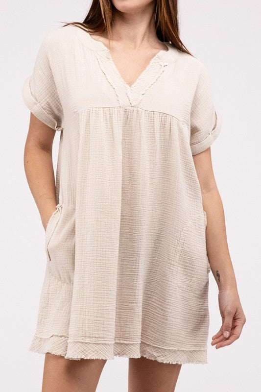 Gauze Rolled Short Sleeve Raw Edge V-Neck Dress