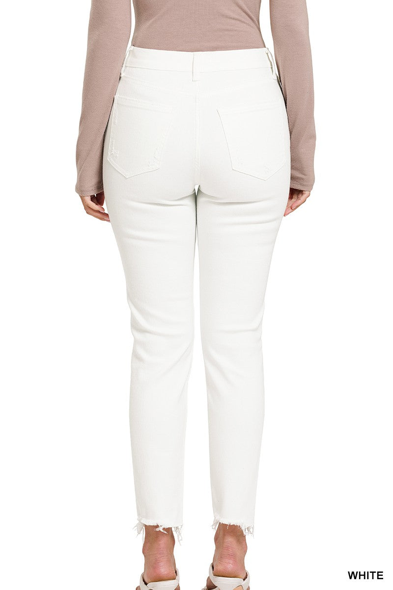 BUTTON FLY RAW HEM SKINNY WHITE DENIM PANTS - STRETCH - RAW HEM