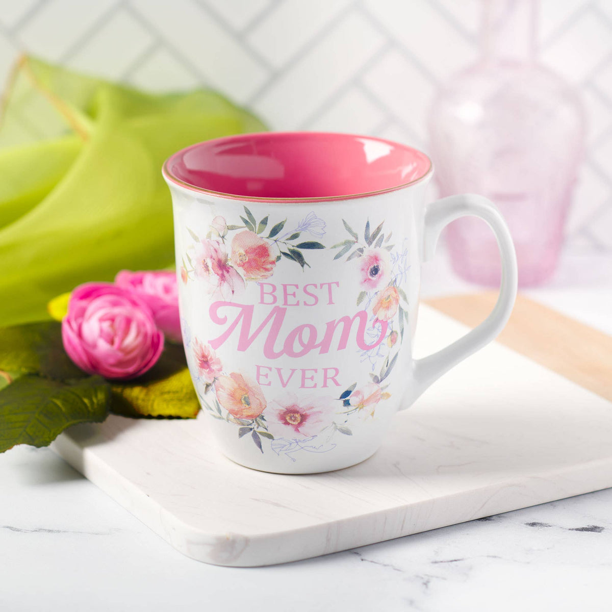 White background with spring floral wreath, Pink screen-printed text, Best Mom Ever, Scripture verse on the back in pink letters, The Lord bless you and keep you, Numbers 6:24, Bless You and Keep You Mom Collection, Ceramic mug, Pink interior, Not microwave and dishwasher safe due to delicate foil, Handwash recommended, Packaged in a tuck-top Kraft cardboard box, Mug dimensions: 4.4" x 5.2" x 3.9" (112 x 132 x 99mm), Packaging dimensions: 4.5" x 4.9" x 4.1" (114 x 124 x 104mm), Capacity: 14 fl. oz. (414ml)