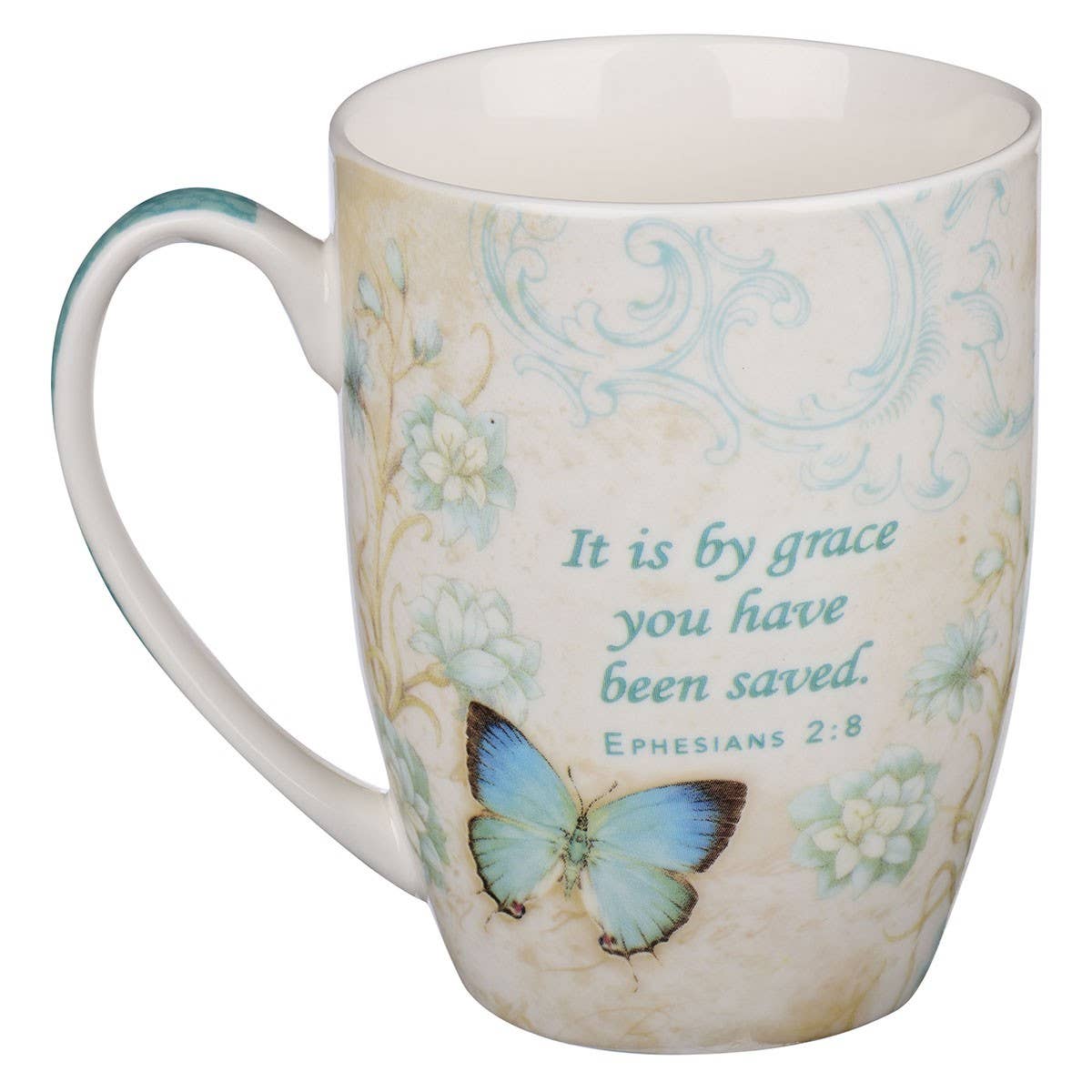 The Botanic Butterfly Blessings Blue "Grace" Mug will delight gardeners and butterfly lovers alike. Featuring the artwork of Jane Shasky with her fresh botanicals embellished with elegant calligraphy fashioned as a "carte postale" serving as a background for a signature blue butterfly. The back of the mug features a line of Scripture from Ephesians 2:8.