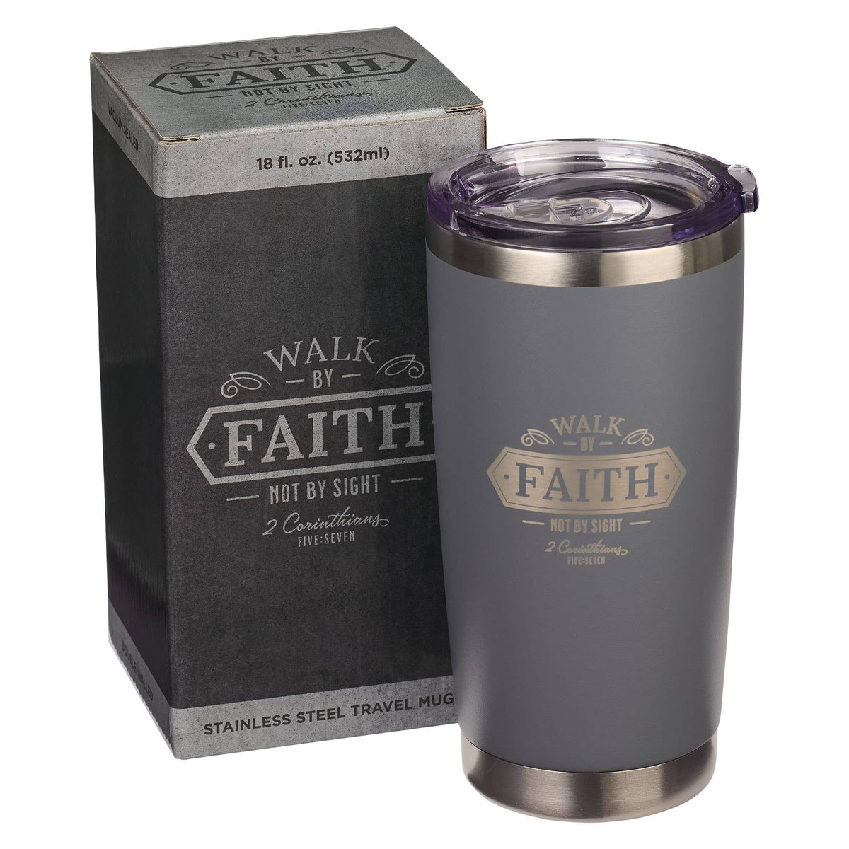 Gray background with silver stainless steel text, Stainless steel travel mug, Laser engraved text, Walk by faith not by sight, 1 Corinthians 5:7, Black and Gray Walk by Faith Collection, Clear plastic lid, Retractable sip-hole cover, Double-wall insulated, Stainless steel interior, Hot or cold beverages, Matte finish, Not dishwasher, microwave, or freezer safe, Handwash recommended, Packaged in a tuck-top Kraft cardboard box, Capacity: 18 fl. oz. (532ml), Mug dimensions: 7" x 3.6" x 3.5" (178 x 91 x 89 mm), Packaging dimensions: 7.4" x 3.8" x 3.7" (188 x 97 x 94 mm)